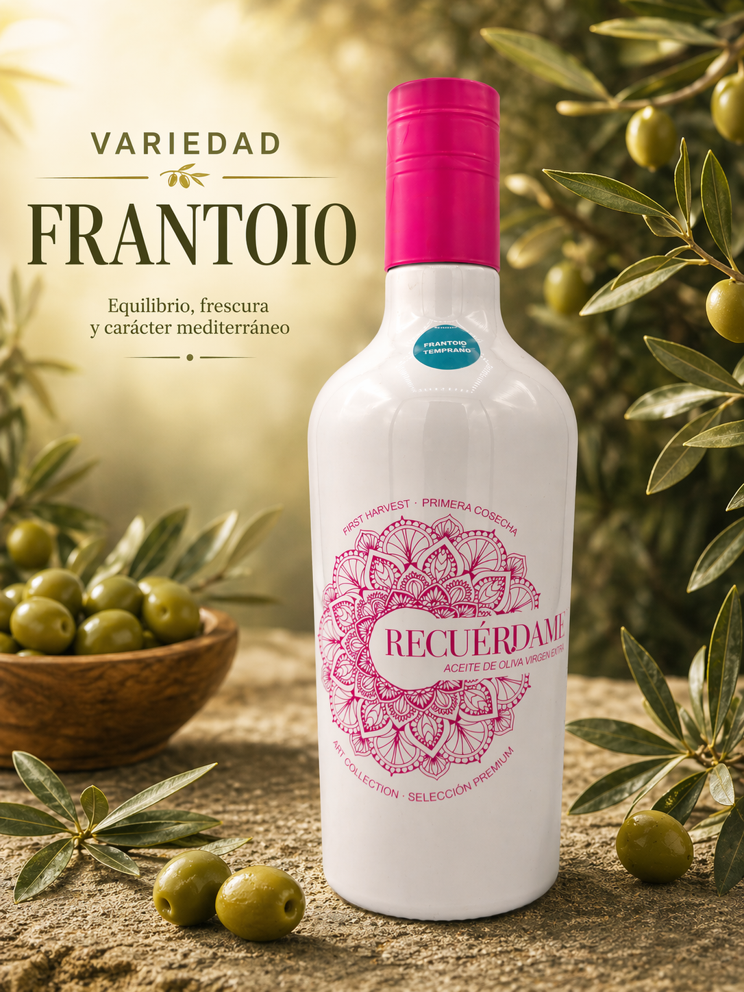 Este Aceite de Oliva Virgen Extra Frantoio «RECUERDAME» seduce desde el primer instante.